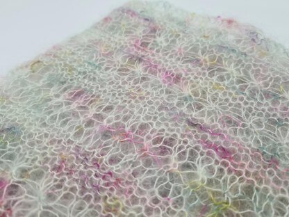 - Yarn: Black Elephant Yarn Lace Mohair (72% Mohair, 28% Silk ) 420 m/460 yds per 50 g skein: Colourway: Silver Lining Meterage: 336 m Yardage: 368 yds