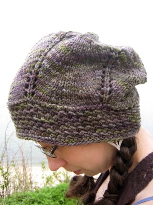 The slip stitch pattern around the lower portion of the hat produces a squishy material perfect for cuddling your ears. Once this section is completed the design moves toward a simple lace repeat. Gauge increases during this portion to allow for a slouched appearance. The crown of the hat is finished with leaves that curve inward toward the center.