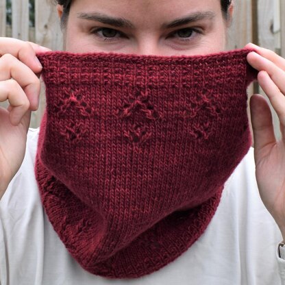 This beautiful lace cowl has beautiful lace detail inspired by the flowers along the garden path. It also has a lovely ribbed border around the top and bottom edges. For the lacework, the even rows are knit plain and for the odd rows the lace stitches are worked (including K2tog, SSK, YO, ktb).