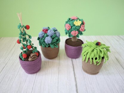 Not good at keeping plants alive? No problem, just crochet yourself a beautiful garden, no maintenance required! This set of four garden plants includes a Rose Tree, Hydrangea Bush, Grass Plant and Tomato Plant as well as three cute little bugs to add a little bit of wildlife to your garden.