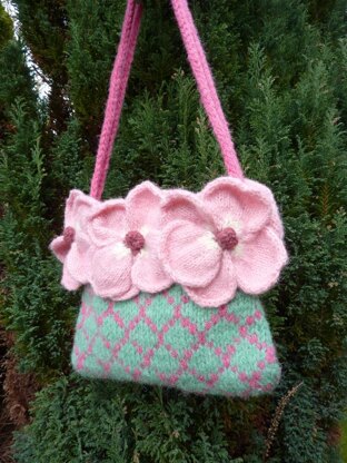 Made in bulky and DK weight yarns, the bag is worked in one piece, and separate flowers are added to the top.
