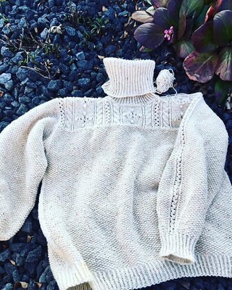 The sweater is worked bottom up, starting with a seed stitch section, followed by a shoulder yoke pattern representing flowers and growing plants (cables and eyelet stripes). The sleeves are worked top down. The sweater has a positive ease of 15-20cm/6-8in.