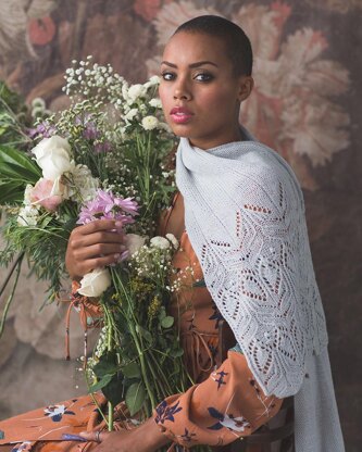 The lace patterning of the Gardenia Stole was inspired by angel wings and peacock feathers. The stole is worked fl at in two pieces, starting with the lace edges, and then grafted in the center using Kitchener stitch. The merino-silk laceweight yarn creates an elegant drape, even while held double throughout the project.