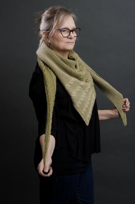 Finished Measurements: Wingspan x depth at centre after wet blocking: 67 (80)“ x 19 (25.5)” / 170 (203) cm x 48 (65) cmYarn: 500 (750) yds / 457 (686) m DK weight yarn that achieves gauge. The sample is shown in Knit by Numbers by JohnArbon Textiles in KBN 58-60.Size: US size 7 / 4.5 mm long circular needle for holding a large number of stsNotions: Tapestry needle, cable needle, safety pin, or removable markerGauge: 20 sts = 4” / 10 cm in Garter Stitch after wet blocking (gauge is not overly important; however, it will alter yardage and finished measurements)Skill Level: Intermediate / Adventurous BeginnerNotes: Asymmetrical triangle shawl, knit sideways and designed so the knitter can use as much of their yarn as possible. Both written and charted instructions are included in the pattern