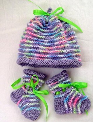 Easy to knit, this set of cap and booties will keep a precious newborn warm. Simple knit and purl stitches create the raised ridges. Knit in the round with an I-cord topper.