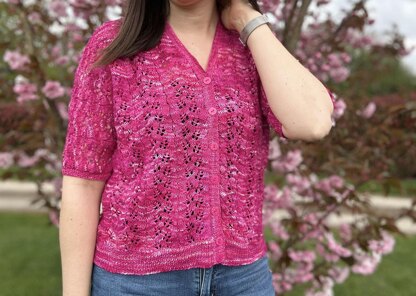 Gaura is a V-neck cardigan pattern with a drop-shoulder construction. It is worked from the bottom up, first in a 1x1 rib stitch, then in a beautiful lace pattern.
