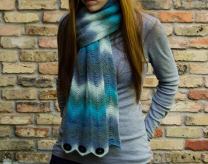 The Gazania Scarf is a simple but striking chevron print scarf. It has buttons to transform it into a cowl, so it can be worn in many ways and will go with any outfit. The scarf is knit in the round creating a double thick and luxuriously cozy fabric, but it is worked at a somewhat loose gauge so it knits up quickly and creates a loose enough fabric to create lovely drape. The striking chevron print is knit with self-striping yarn while the patterning is in the stitches, so the yarn does all the work.