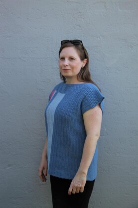 Dansk: En farverig, lidt tykkere sommertop. Den kan både anvendes alene over en nederdel eller et par bukser om sommeren, men den kan også anvendes med en langærmet bluse under i vinterhalvåret. Den hækles primært i stangmasker. Garn: ca. 9 nøgler Cotton merino fra Drops i 3 forskellige farver. Nål: 4,0 mm. One size, men kan nemt gøres kortere eller længere. Færdige mål, ca.: 52cm bred og 58cm lang.