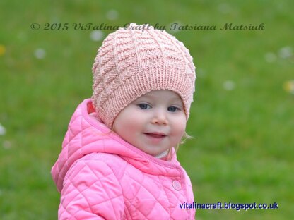 This beautiful knitted hat is perfect for cool spring days. It is knitted with fancy geometrical pattern and suitable for both male and female. The hat is knitted in the round with DK/8-ply cotton yarn in pastel peach color. It can be also knitted with wool yarn for winter time.