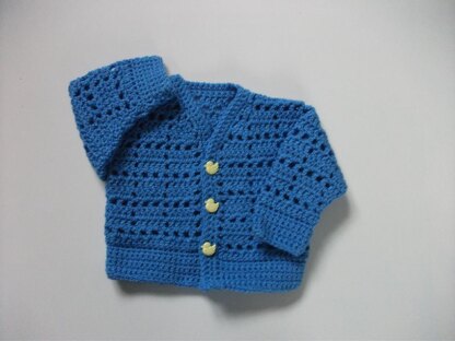 This is a loveable cardy for a newborn baby, can be made in blue or pink. The simple filet design is easy to follow for the beginner.