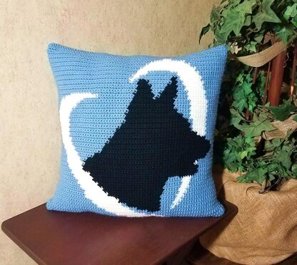 Pattern includes instruction and tips for how to do intarsia crochet, specific instructions for THIS particular pattern and a colored graph. “I Love This Yarn” brand yarn was used for this pattern, however any medium weight (#4) worsted weight yarn with comparable colors can be used. Front of the pillow has the german shepherd art, the back is plain “stonewash” blue.