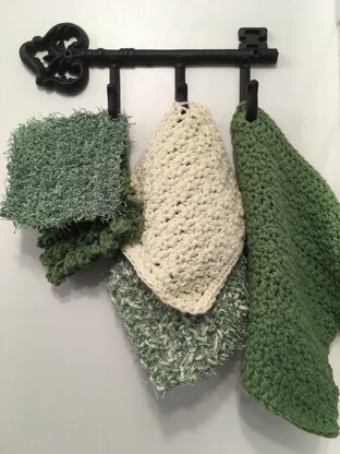 Finished sizes are approx. Wash Cloth: 7”x 8” Scrubbie Cloth: 7”x 5.5” Scrub pad: 3.5”x 3.5” Small Bordered Cloth: 5”x 5” Small Loopy Cloth: 4”x 3.5” measuring back. 4”x 4” measuring front once loops spread