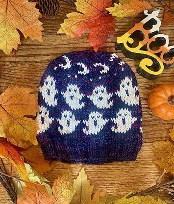This hat matches the Get Ghosted Dog Sweater. Hat is knit in the round from bottom up, using two contrasting yarn colors. Fair Isle stranded knitting technique is used.