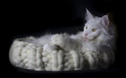 This kitty bed / cat basket is knit in the round on large circular needles, using the Magic Loop method. It can be worked from the centre outwards (bottom up), or from the outer rim downwards (top down). Both options are included in the pattern.