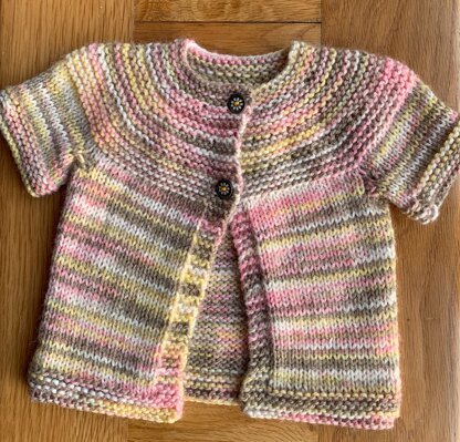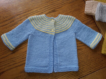 Gidday Baby is a superbly simple cardigan. A striped garter stitch circular yoke is accentuated with cute buttons and a stocking stitch body. This cardigan is knit top-down and seamlessly, with attention paid to the simple details. The body is knit flat and the sleeves are knit in the round. Simple yarn over increases, which can be worked as a feature or closed, are used to shape the yoke.