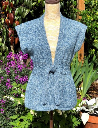 A really useful smart but casual gilet. The flattering cabled waist border is framed with a slip stitch band to match the lower and sleeve borders. The front borders and ties are ribbed and there is subtle shaping in the lower section giving a comfortable fit.