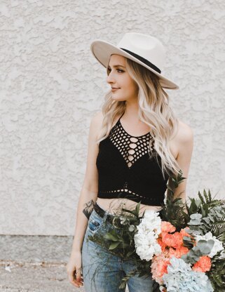 The Gilmore Bralette is a cropped festival top featuring a mesh neckline with a matching eyelet detail along the bottom front edge, and a lace-up back. Crocheted in a worsted weight cotton yarn, this piece is made for hot summer days and can be completed in just a day or two.