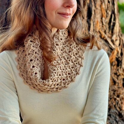 Rich in texture and visual interest, this cozy cowl features a simple shell stitch pattern accented with angled post stitches to create the illusion of a textured overlay. A bobbled edging adds a touch of quirky character.