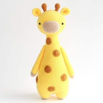 The giraffe in the picture is made with Stylecraft Special DK yarn on a 2.75 (size C) hook and turned out to be 30 cm tall (about 11.8 inches).
