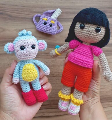 Girl explorer measures 22cms, cotton yarn DK / light and a 2.2mm crochet. The monkey measures 14cms.