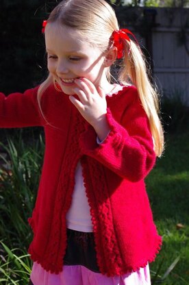 This is a sweet little seamless cardigan, knit top-down. It features sweet lace panels and eye-catching little gathers at the cuff and hemline. A dainty picot edging finishes off the cardigan.