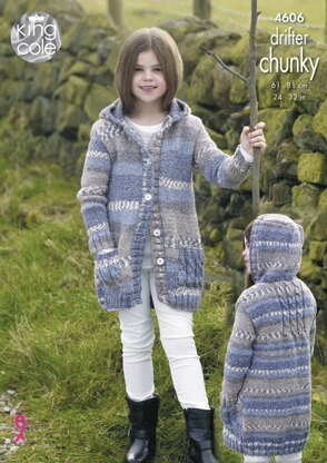 Girls' Coats in King Cole Drifter Chunky - 4606 - Downloadable PDF is a Advanced Knitting pattern by King Cole, available as a Downloadable PDF and includes instructions in English. Super fun to make, this pattern could be your next masterpiece!