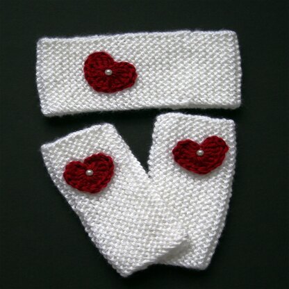 These cute "girls" heart finger-less gloves and head warmer's, are so easy to knit. It's the basic garter stitch throughout, uses only 1 skein of the main color and just a tad of another color for the hearts. You will also need a tapestry needle and either a pearl or a button for the center of the hearts. Happy knitting!