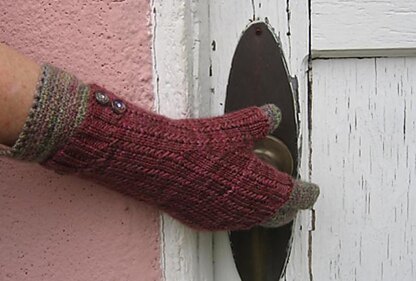 The pattern includes instructions for both a pair of fully-fingered gloves and a pair of fingerless mitts. They can be worn layered or singly, and if layered, they can be buttoned together at the wrist.