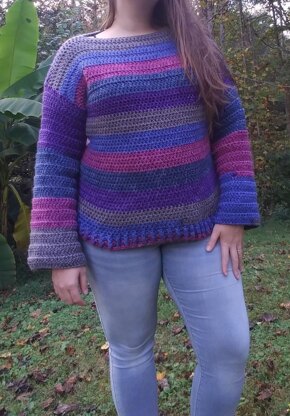 • This sweater pattern is designed to be straightforward and quick to make. It is made in the round and slip stitched it join with ribbing at the cuffs. The pattern has a slight positive ease, with a boxy, slightly oversized look! It’s made mainly worked in double crochet. This sweater is oversize and is suitable for beginners familiar with basic crochet terms. • As each round is joined with a slip stitch, this provides the opportunity for as many colour changes as possible for some variety if you wish. • The sweater can be made longer by adding additional rows before the “neckline splitting” section. Be sure to add the same number of rows to the back panel. Please consider that you will need extra yarn, if increasing the rows. • This pattern is worked from the bottom up in working in rounds, with minimal seaming. The sleeves are made separately and attached using a slip stitch.