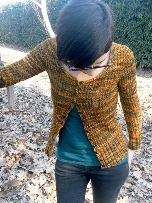 Glitter is a seamless, textured scoop neck cardigan mostly worked flat, from the top down with narrow sleeves and a high ribbed hem. The garment features the contiguous set-in sleeves method developed by Susie Myers and a very stretchy stitch pattern that allows a comfortable “pin up” style with minimal finishing steps. The broken rib pattern is perfect for exploiting multi-coloured hand dyed yarns. This cardigan is intended to be worn with negative ease to improve the texture.