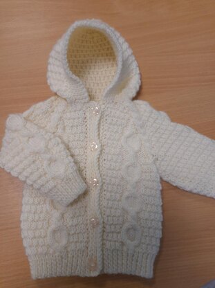 Baby hoodie in globe cable and offset broken rib pattern, age 0-6 months, 18" chest. Actual measurements chest 20", length 11", sleeve 6.5"