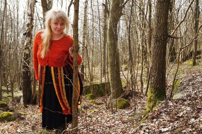 Glöd, Swedish for "embers" is just that fancy and attention craving creation that you've been looking for! The cardigan is worked in one piece from the top down, with a rounded neckline and a simple empire waist stockinette body. The bottom part worked in strips of garter stitch is an excellent opportunity to go wild in the yarn stash and compose your own favorite palette of colors. Easy knitting with a spectacular result!