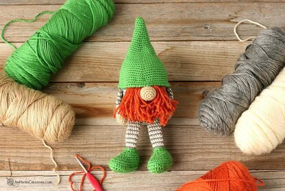 - Yarn for gnome pictured includes Caron Simply Soft in Green, Bone, Off White, and Pumpkin, and Caron Simply Soft Heathers in Grey Heather.