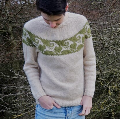 This aran-weight sweater is made all in one piece from the hem upwards, with no seams to sew. The Body and Sleeves are worked separately, and joined together at the yoke. The colour-work pattern is fully charted, and is worked using the stranded technique.
