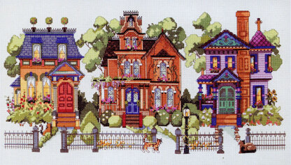 By Nancy Rossi. The charm builds! Immensely impressive Victorian mansions with inviting nostalgia and charisma boast of the architectural elegance of a by-gone era. This Counted Cross-Stitch design will catch your eye as the kitty in each yard captures your fun-loving fancy.