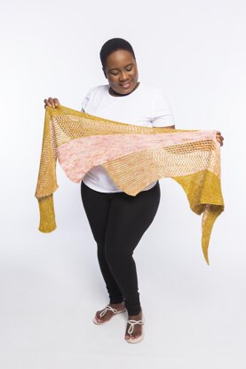 This 2-colour shawl has an interesting construction. Short rows are used to shape the segments of the alternating garter and lace sections, while the two colourways create a cohesive look.
