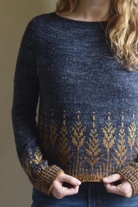 Goldenfern is a simple, seamless circular yoke sweater with colorwork details on the body and sleeve cuffs. This design is inspired by ferns lit aglow by the sunset on an evening walk in the forest. Knit from the top down, you can try on this sweater while it’s in progress, for your ideal fit. This yoke is very easy to knit - it includes a little bit of raglan shaping before the body and sleeve separation, to make for a great fit in the shoulders. For the colorwork, use 3 colors of your choice to create a fading effect, a single contrasting color or you can use a gradient yarn. Fingering or sport weight yarn. Designed to be worn with 4-8”/ 10-20.5 cm positive ease. Shown in size B with 4” / 10 cm positive ease.