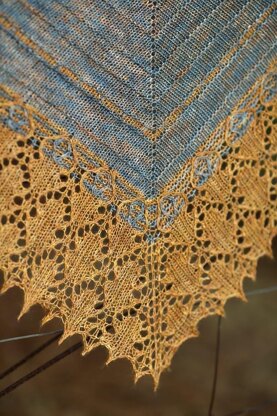 Goldenoak is a textured triangular shawl designed to play with colour. A relaxing stockinette start is broken by occasional garter ridges is followed by a decorative introduction of the second colour. This is followed by a short section of mosaic with slipped stitch cables floating over the top, leading into a beautifully textured lace edge, based on a secret code lace stitch by Naomi Parkhurst.