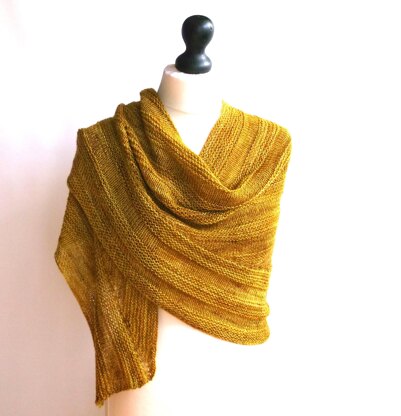 This shawl design starts with section one worked bottom up in bands of garter stitch and stocking stitch, with increases at each end. Stitches are then picked up around the bottom edge of section one and section two is worked in the same pattern top down.