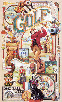 By Linda Gillum. Antique Memorabilia and images of the golf scene revive memories of a fun-loving relaxing sport! If you are under "par" take a "swing" at this design in Counted Cross-Stitch to make a "hole-in-one" Your favorite golfer won't get "teed off"when you complete this "round".