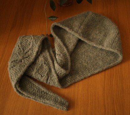 The Good Winds Hood is a seamless, flat-knit hooded scarf worked in sequential sections. It begins with a seed-stitch rectangle that forms the top of the hood, with stitches picked up along one edge to shape the hood. The hood is worked in seed stitch to the desired length, then divided to create two scarf panels. An applied i-cord runs along the front edge of the hood and continues down the scarf edges, giving a neat, built-in finish. Each scarf panel begins in seed stitch before transitioning into a lace pattern, tapering gradually with even decreases for a soft, elegant drape.