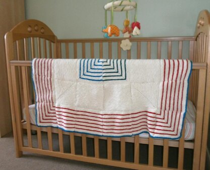 Goodwood is a baby or child-sized blanket (36" x 48", 90cm x 120cm). With bold garter stitch stripes, it’s suitable for a boy or a girl.