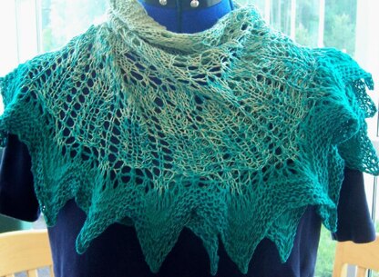 The shawl starts out with a garter tab which is then turned on its side and increases from the neck to the scalloped hem. Circular needles are used for the immense number of sts (when you're done you'll have 343 sts to bind off!