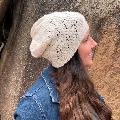 You only need 140 yards of yarn to make this lovely beanie. The weaving lace pattern is beautiful and dense enough to keep your head warm on the chilliest of days.