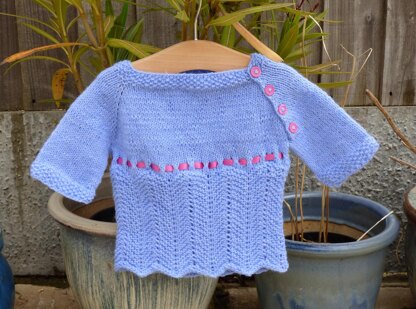 This is a lovely pattern for small children & babies - it is front fastening with a raglan buttonhole opening, eyelets to thread ribbon through, a sweet scalloped lower edge & 3/4 length sleeves.