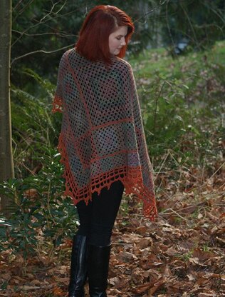 The shawl consists of a series of graduated sizes of granny squares and triangles, pieced together to form one large triangle with accent stitching and a lace border.