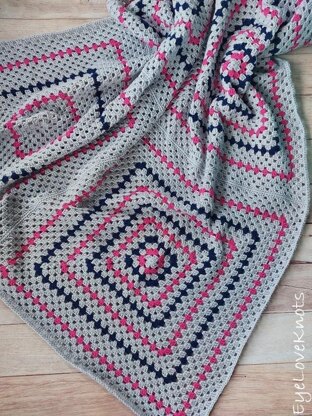 How to crochet an easy king size granny square afghan pattern built of 12 squares crocheted together in one continuous manner. Video tutorial included. You'll need 5990 Yards of Worsted Weight Yarn - I used Red Heart Super Saver Yarn in Light Gray, Shocking Pink and Soft Navy. Each Square used approximately 470 Yards, then the Join used an additional 350 Yards. You'll also need an H8/5mm crochet hook and tapestry needle. For reference, each square took me about 6 hours to work up -> that’s 72 hours for 12 squares. Joining all the squares took approximately 12 hours, with some breaks here and there. Grand total, approximately 84 hours worked over 6 months. Squares are joined using the Continuous Join & Pull Loop Through methods together, and both are explained.