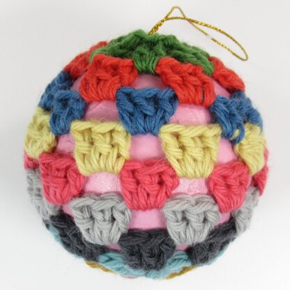 The bauble cover is crocheted in the round using aran or worsted yarn and the finished bauble is a little over 7cm (2 1/2 inches) in diameter.