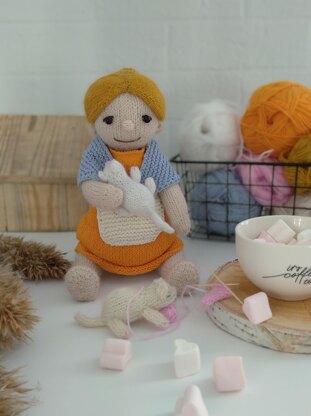 Yarn Alize Angora Real 40 430 m/100g #67- for body Alize Angora Cold 550 m/100g #02- for hair Alize Cotton Gold Fine 470m/100g #83- for dress Alize Cotton Cold 330m/100g #40- for shawl Alize Angora Cold 550 m/100g #55- for kitten YarnArt Jeans 160m/50g#03- for apron