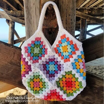 This is an on trend crochet purse design and a great way to use up leftover yarn or plan out your favorite colors. An easy square, and intermediate JAYGO method to join the squares into the shape, then add a tubular rope handle to complete the look of this pretty bag.